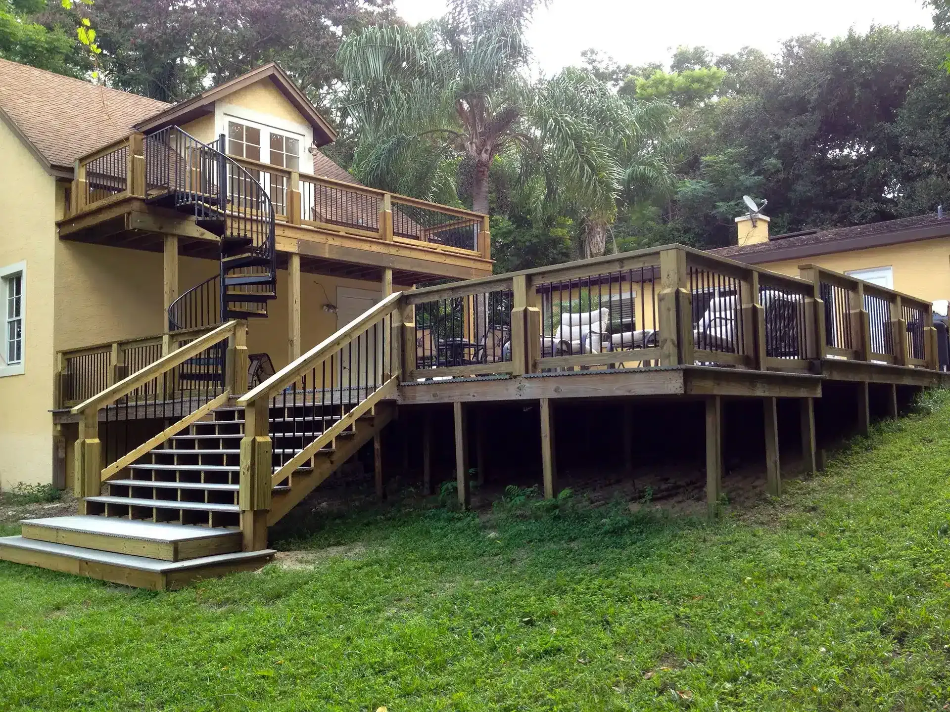 The new balcony provides a great vantage point for viewing the lake while adding a bit of intrigue with the spiral staircase. We overhauled the railing on the main deck area to match that of the balcony and we added a “grand” set of stairs leading to the backyard and lake area. The area went from run-down and dilapidated to being the focal point of the residence and adding great value to the home.