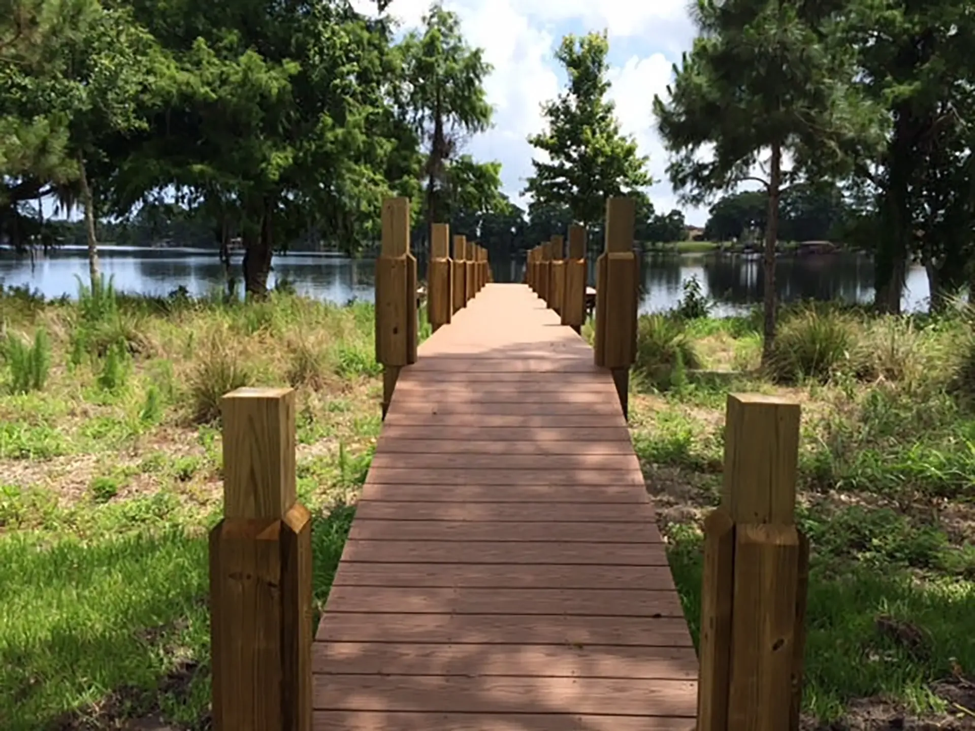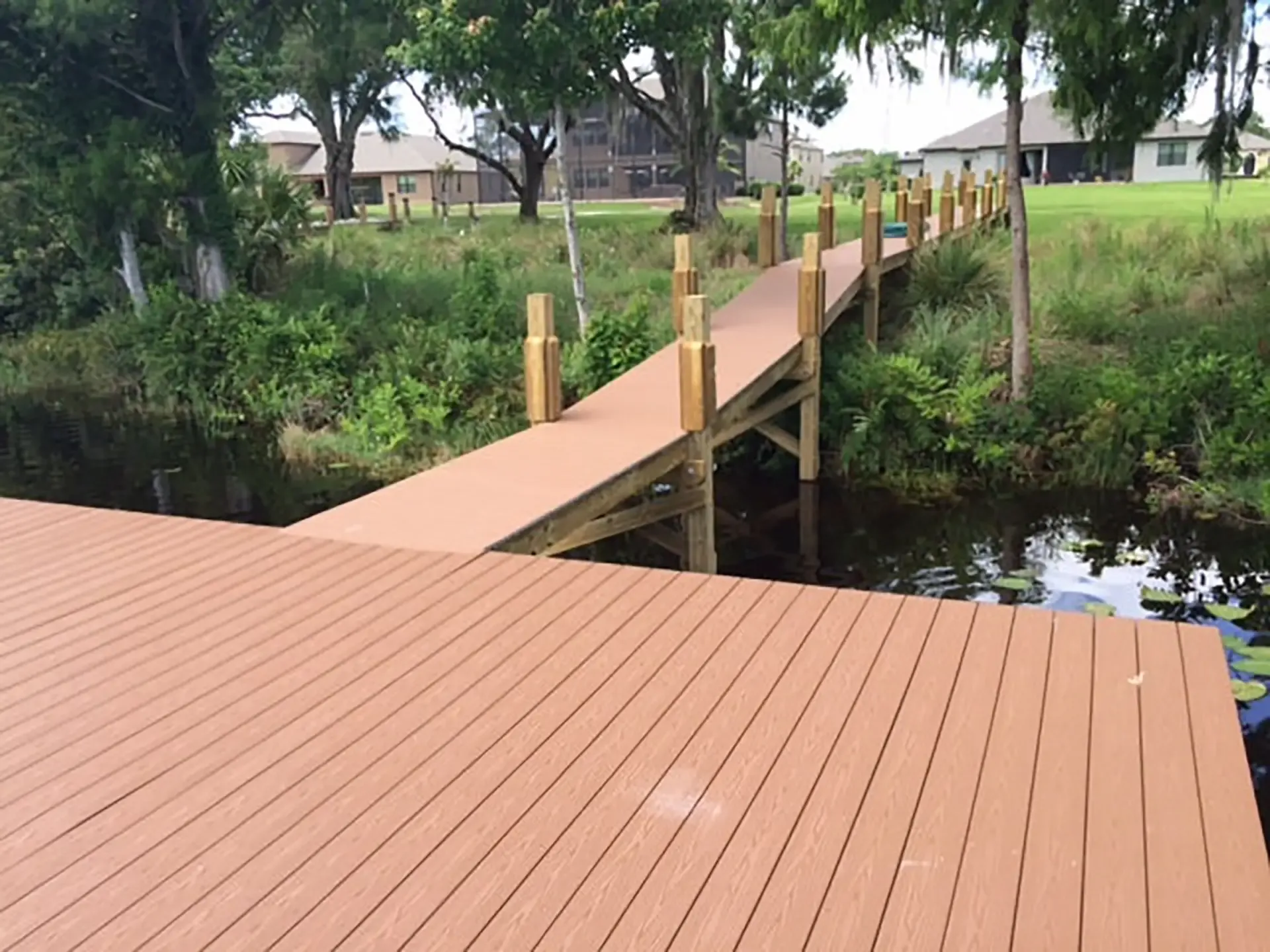 While we love a good challenge, we also love the simpler things – or docks – in life. 100ft of cabin colored walkway leads onto a square platform that overlooks Lake Drawdy, granting any curious spectator a sturdy place to stand (with an excellent view to boot!). Fiberon composite decking was our client’s choice, which gives the dock its smooth, even look. This sort of dock proves that you don’t always have to be “big and bad” to enjoy a peaceful piece of the lake.