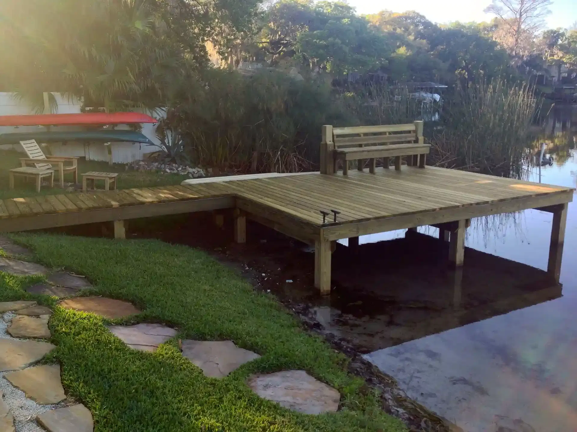 Through the hustle and bustle of downtown Orlando, it can be hard to take a breather sometimes. So why not kick back, relax, and admire the natural beauty of Lake Rowena? Replacing an older deck was this brand spanking new one comprised of yellow pine decking. We also worked with our client to include a built-in bench to achieve ultimate relaxation after a long day of city life.