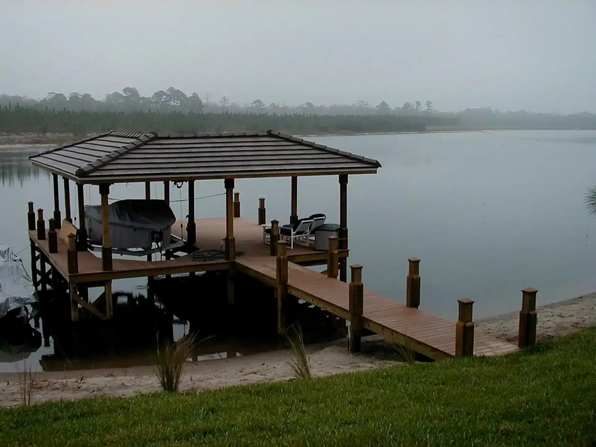 You can see that we cut the pilings below deck level and added a picture frame border to give the dock clean, modern lines. The furniture also got an upgrade and a new flat screen TV was installed under the roof to complete the overhaul. Happy skiing!